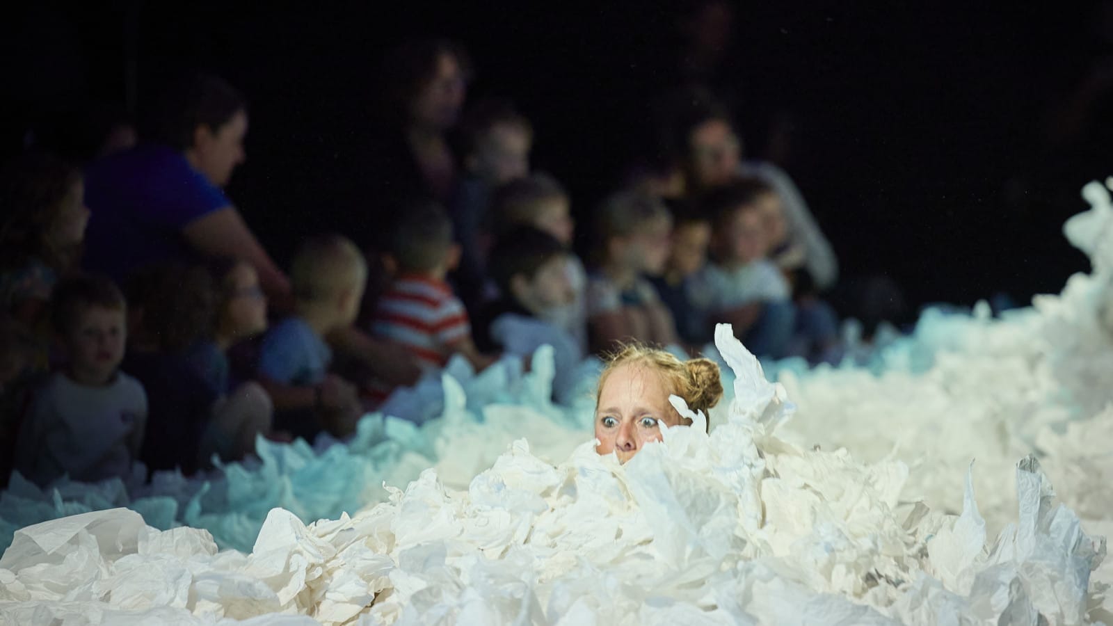 Beneath the Snow is an exciting, playful and enchanting adventure with beautiful music and lighting. In this immersive show, two figures dressed in white walk on a white carpet made of lots of tissue paper. You can hear the sound of the wind and the snow crunching under their feet. They playfully awaken what lay dormant, opening the doors to the imagination.